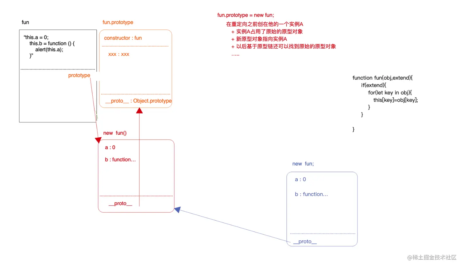 (5)我们一般这样对原型链进行改变,extend为true代表是重构原型链 obj是我们要添加或者覆盖的属性;所以我们现在执行fun.prototype = new fun({a: 1},true)即可