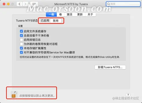 第二步:在“一般”设置界面中,点击下方的锁按钮,解除锁限制,然后修改Tuxera NTFS状态为“已启用”,如下图2。这里需要勾选上“总是挂载不干净的卷”,否则在Windows系统上没有安全弹出的磁盘,是不会在Mac系统上被挂载的。