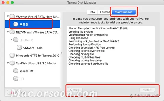 完成上述启用Tuxera NTFS软件后,如果还不能往磁盘中写入文件,那就要考虑是否是磁盘出现了损坏的情况。
