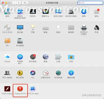 首先打开Mac的设置窗口,然后找到Tuxera NTFS设置项,如下图1红框,打开它。