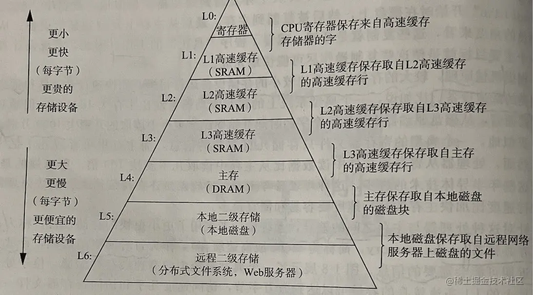 CPU 寄存器在顶部,接着是多层的硬件高速缓存存储器、DRAM 主存和磁盘存储器。在层次模型中,位于更高层的存储设备比底层的存储设备要更快,单位比特造价也更高。层次结构中较高层次的存储设备可以作为较低层次设备的高速缓存。