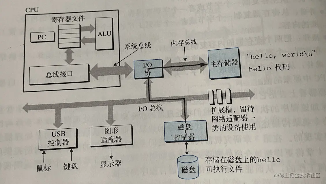 当我们在键盘上敲回车键时,shell 程序就知道我们已经结束了命令的输入。然后 shell 执行一系列指令来加载可执行的 hello 文件,这些指令将 hello 目标文件中的代码和数据从磁盘复制到主存。数据包括最终会被输出的字符串“hello, world\n”。
