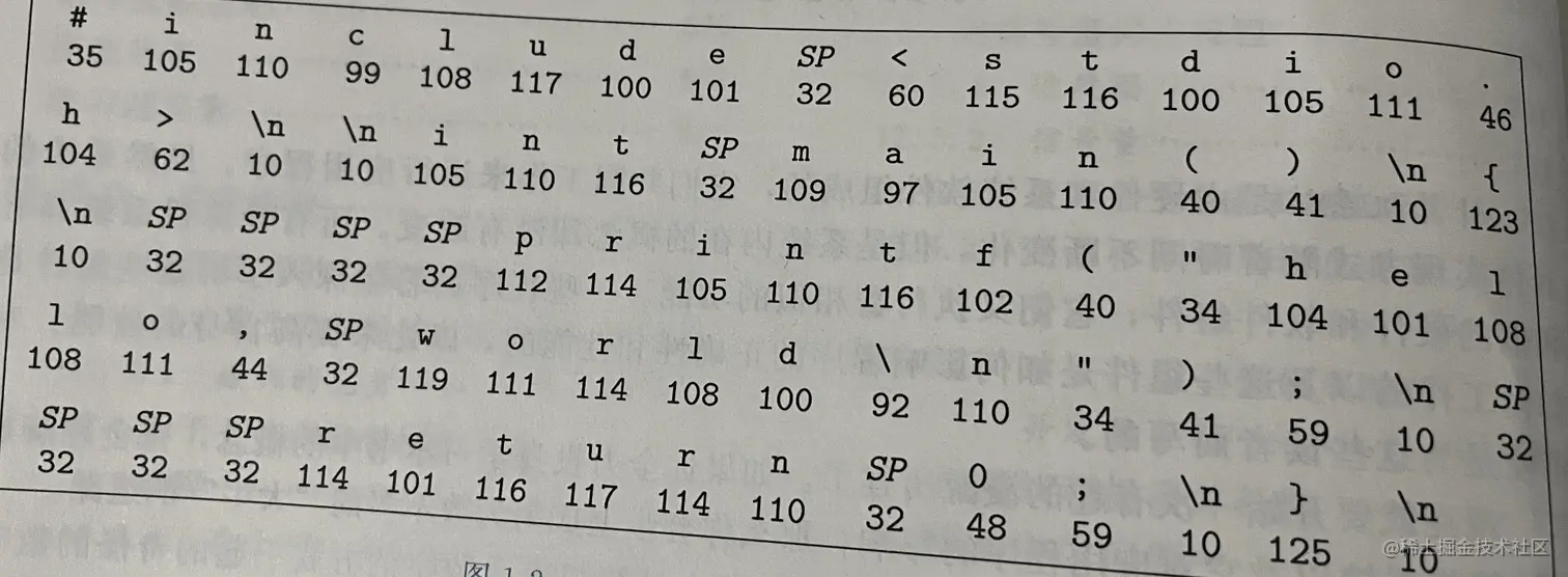 文件名hello.c 的源程序实际上就是一个由值 0 到 1 组成的位(又称为比特)序列,8 个位被组织成一组,成为字节。每个字节表示程序中的某些文本字符。