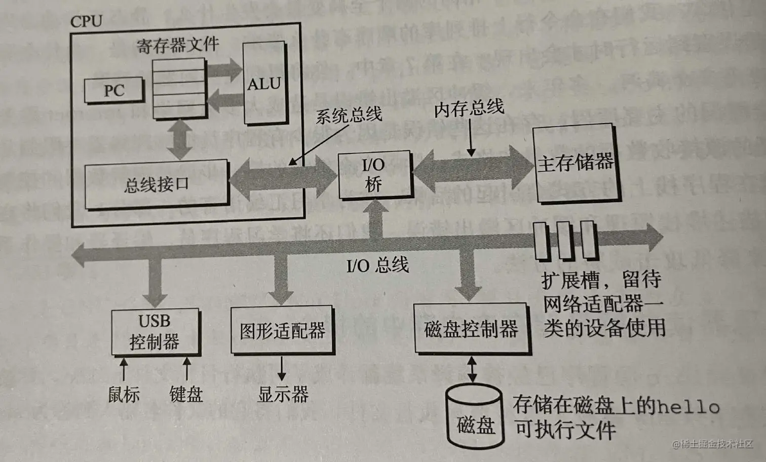 I/O(输入/输出)设备是系统与外部世界的联系通道。包括 作为用户输入的键盘和鼠标,作为用户输出的显示器,以及用于长期存储数据和程序的磁盘驱动器(简单说就是磁盘)。