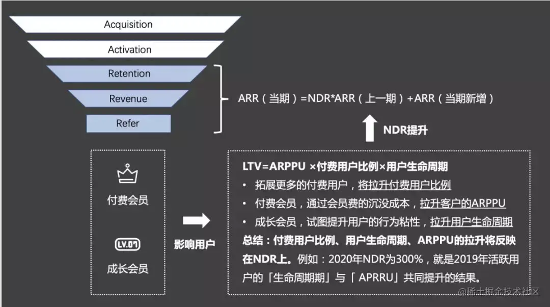 会员体系的核心目标,是拉升「付费用户比例」、「用户生命周期」、「ARPU」;在用户价值层面体现为 LTV 的提升,在用户收入层面则体现为 NDR 的提升,最终推动 ARR 到更高的水平。