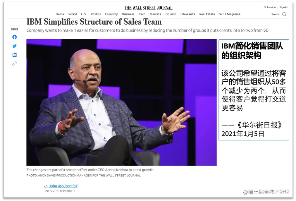 近日,据《华尔街日报》报道,IBM 宣布简化销售团队的组织架构,希望通过将销售组织从客户群分的 50 多个减少为两个,从而使客户觉得打交道更容易。
