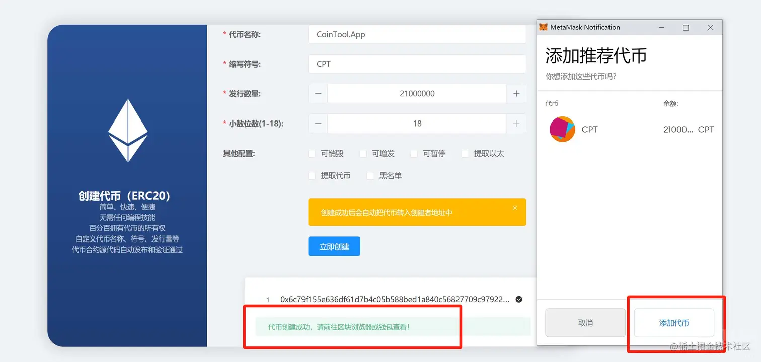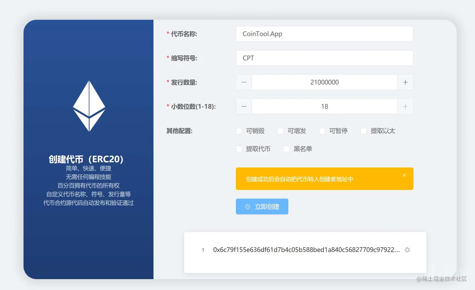 只需几个简单步骤,就完成一键发币啦, 是不是超级简单。
