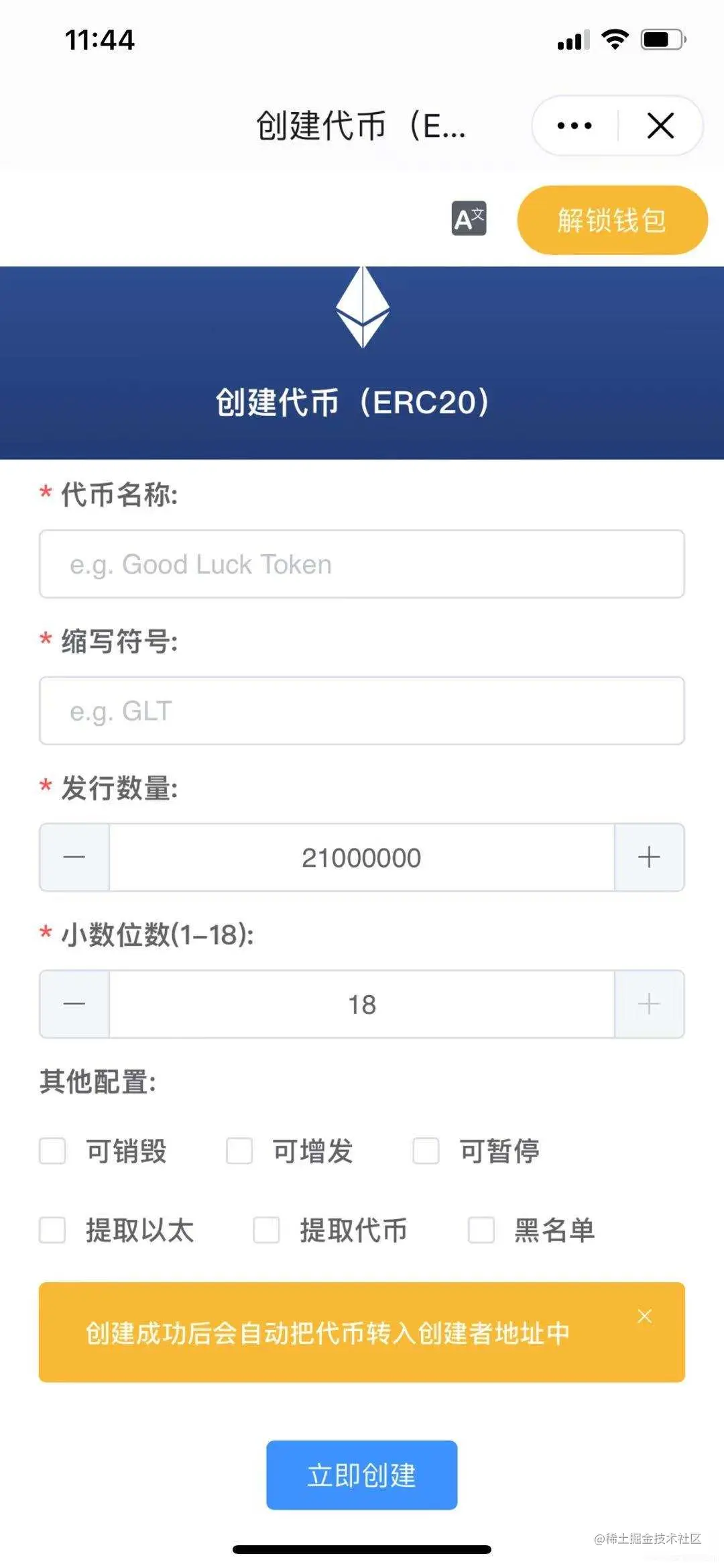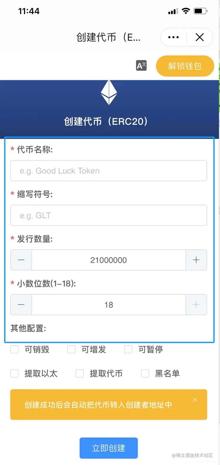 2. 在打开的页面内填写代币基础信息:代币名称、缩写符号、发行数量、并勾选您需要的合约功能,点击“立即创建“。