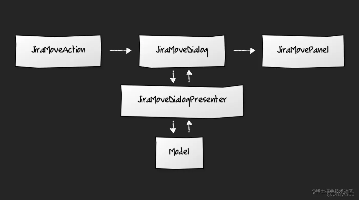 我们的JiraMoveAction将创建一个新的JiraMoveDialog,它将具有一个JiraMoveDialogPresenter,该JiraMoveDialogPresenter将与Model,网络等进行通信。此外,JiraMoveDialog将创建一个JiraMovePanel,其唯一原因是要分离更多的UI层,我将解释说在步骤4中。