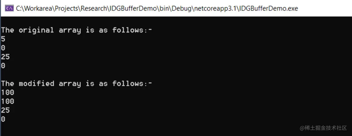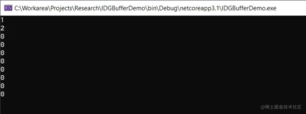 从图中可以看出,一个 short 表示 2 个 byte, 5个 short 就是 10 个 byte,对吧,结果就是 short [].length * 2,所以 Console 中的 10 和 20 就不难理解了,接下来看下 Buffer 的 SetByte 和 GetByte 方法,他们可用于单独设置和提取数组中某一个位置的 byte,下面的代码展示了如何使用 SetByte 和 GetByte。