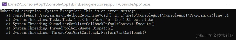 下面的程序展示了返回 void 的异步方法中抛出了异常。