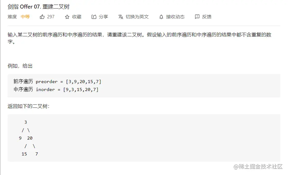 首先前序遍历的遍历顺序是根节点 -> 左节点 -> 右节点,而中序遍历的遍历顺序是左节点 -> 根节点 -> 右节点。我们可以从二叉树的前序遍历确定根节点的位置,进而在中序遍历中根据根节点划分左右子树范围。