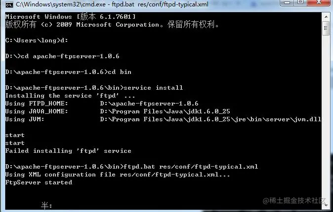 输入完命令之后如下图所示,当出现FtpServer started 出现即启动成功