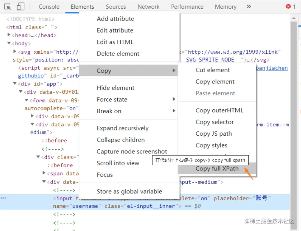 F12打开开发者模式 -> 在想要操作的元素上右键检查 -> 在源码中找到源素对应的代码行 -> 在代码行右键 -> copy -> copy full xpath
