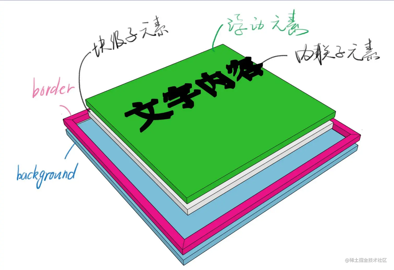 由分层的图片可看出,背景background的范围是 border 的外沿。并且浮动元素脱离了文档流。