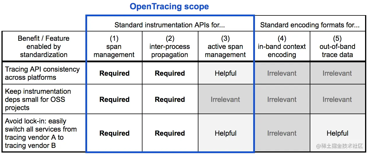 现有的 Tracing 开源项目都是基于谷歌的 Dapper 论文做的实现。里面更多的关注了第4点和第5点。然而实际的情况是第4点与第5点的标准化对于 Instrument 持续可用性是没有什么很大帮助的。而 1-3 点的标准化对于推动其他开源项目加入 Tracing 产生帮助更大,所以 OpenTracing 主要做的事情就是定义一组标准的 OpenTracing API 来实现 1-3 的标准化。