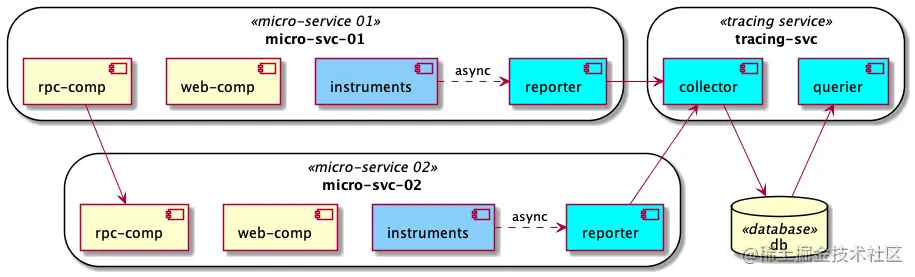 一个 Instrument 是对特定开源组件做 Span 打点后并转给 Reporter 的实现,但是一般 Tracing 不自己实现 Instrument,而是提供产生 Span 的工具,由对应开源组件的维护者编写对应的 Instrument。所以这部分一般不会在 Tracing 架构图出现。