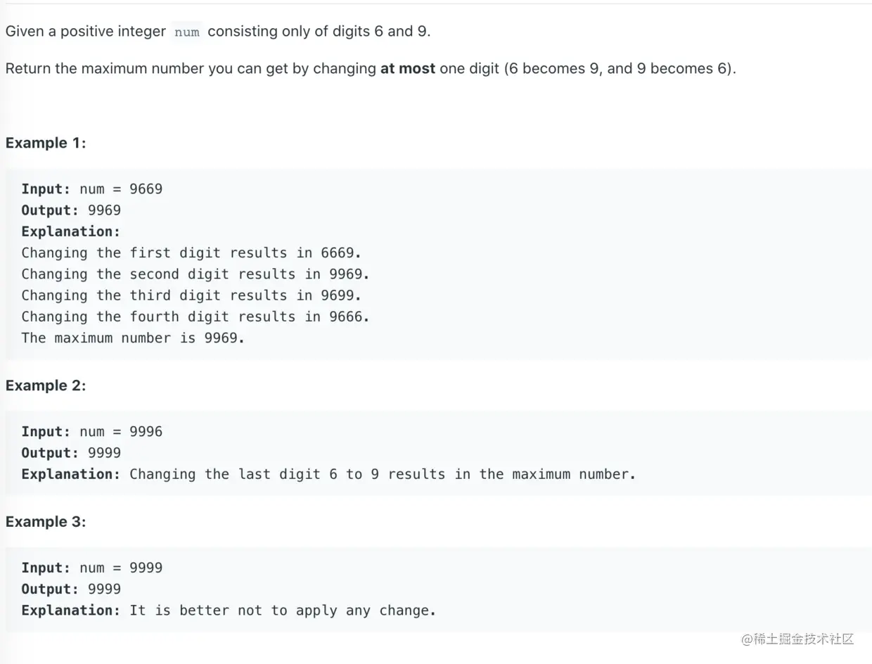 方法: 很简单的一道题,只需要修改从左到右第一个6为9即可,因为高位对大小影响更大。