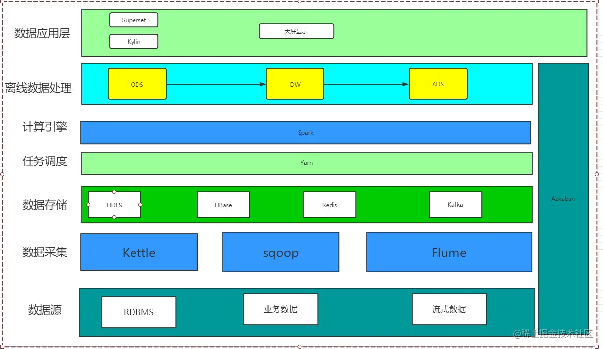 数据采集: Kettle、sqoop、flume 数据存储:HDFS、Hbase、Redis、Kafka 任务调度:Yarn 计算引擎:Spark 离线处理:Hive 数据应用层: kylin 、大屏展示、Superset