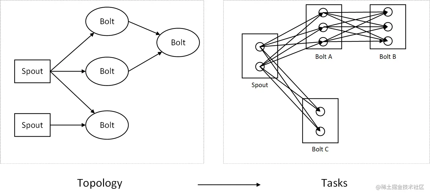 - 计算逻辑类似Map/Reduce, 区别在调度数据而非调度计算,其拓扑及任务分配如下(spout 是输入,根据输入的 key 分发到不同的 Bolt 上处理,最后将结果组成)