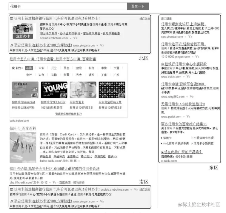 如下图所示,分为北、南、东三个广告区块,根据各位置的reference ctr决定各位置在竞价系统中的位次,reference ctr可以通过流量较准确测定出,一般北区是黄金位置。