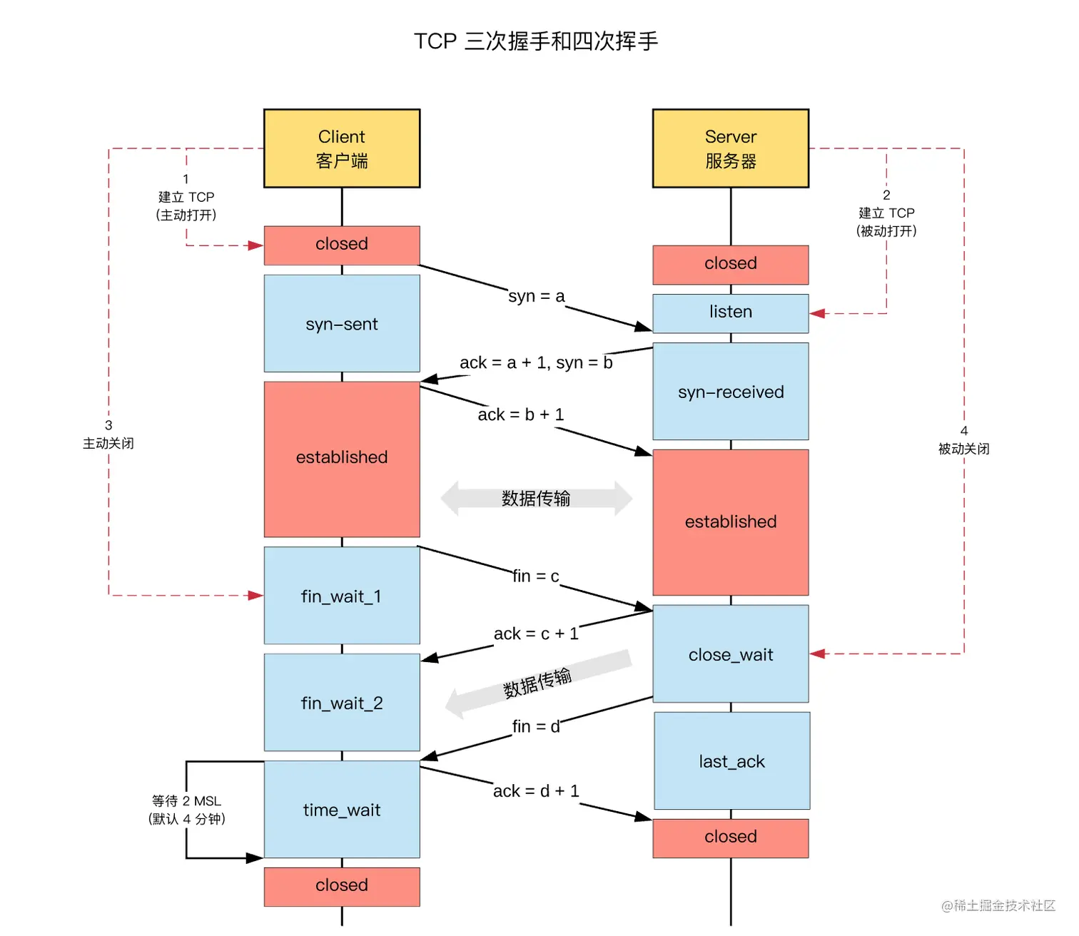 而,TCP 四次挥手关闭连接机制中,为了保证 ACK 重发和丢弃延迟数据,设置time_wait 为 2 倍的 MSL(报文最大存活时间)