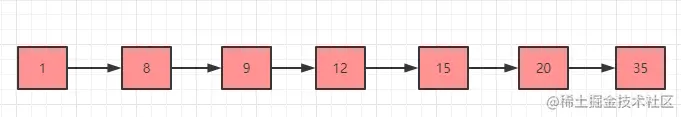 下图是一个普通的有序链表,我们如果想要找到 35 这个元素,只能从头开始遍历到尾(链表中元素不支持随机访问,所以不能用二分查找,而数组中可以通过下标随机访问,所以二分查找一般适用于有序数组),时间复杂度是 O(n)。