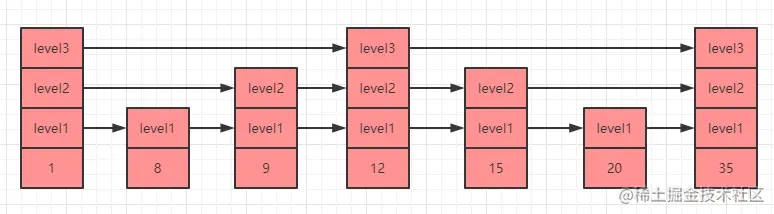 1种就是执行level1层级的指针,需要遍历7次(1->8->9->12->15->20->35)才能找到元素35。 - 第