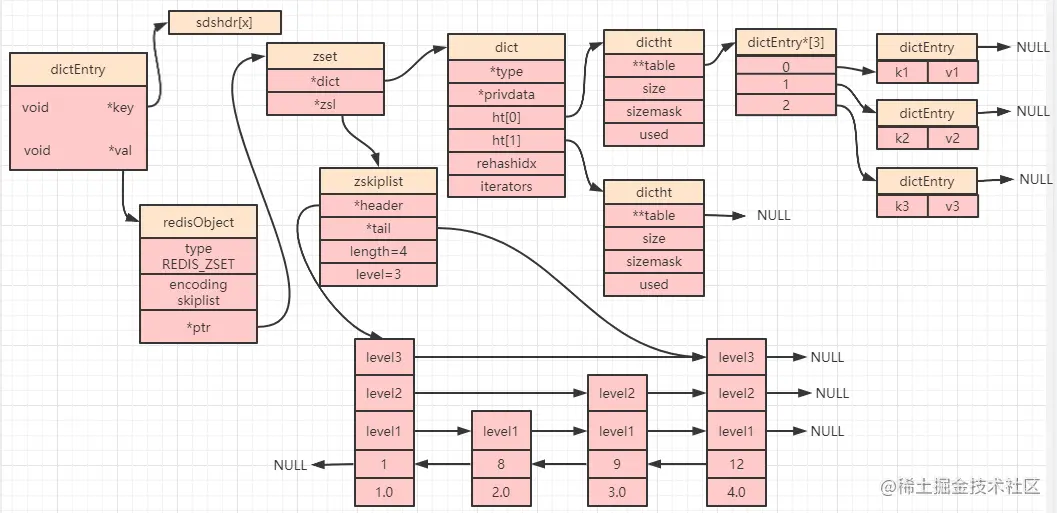 所以最终,一个有序集合如果使用了 skiplist 编码,其数据结构如下图所示: