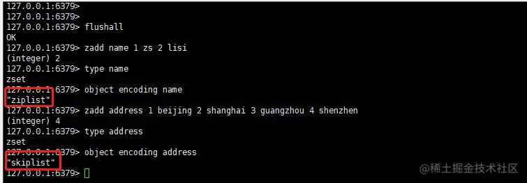 zadd address 1 beijing 2 shanghai 3 guangzhou 4 shenzhen //设置4个元素则会使用 skiplist编码