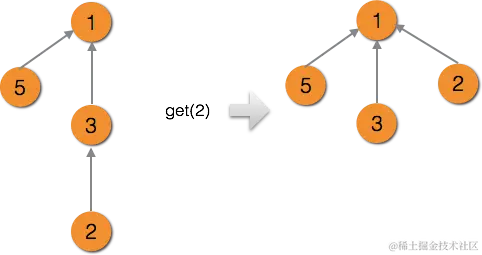 return father[x] = get(father[x]); // 返回父结点的根结点,并另当前结点父结点直接为根结点