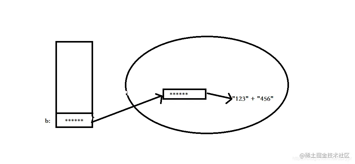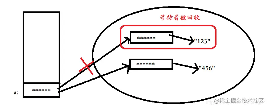 可以看出来,再次给a赋值时,并不是对原来堆中实例对象进行重新赋值,而是生成一个新的实例对象,并且指向“456”这个字符串,a则指向最新生成的实例对象,之前的实例对象仍然存在,如果没有被再次引用,则会被垃圾回收。