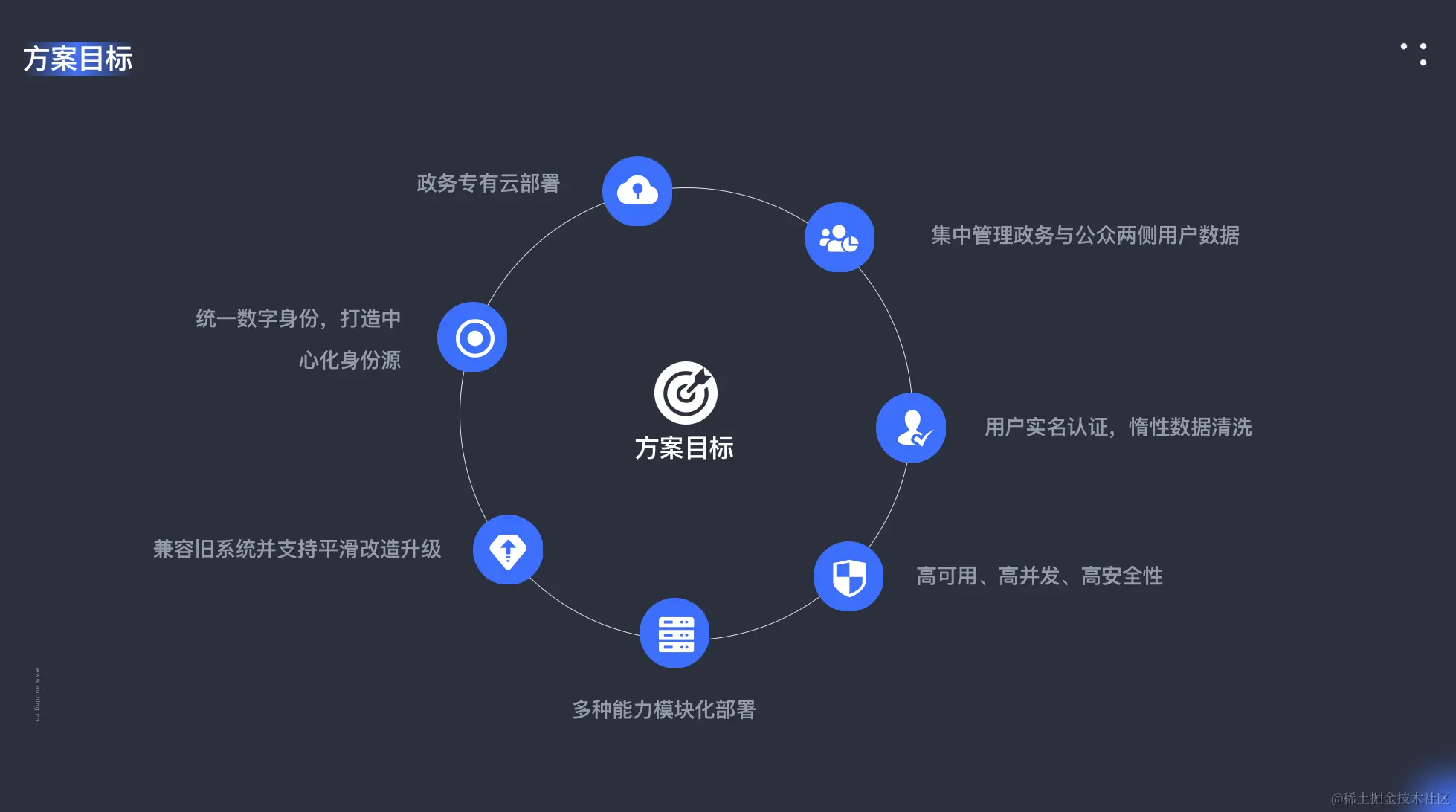 上图是我们方案的预期目标,着重讲两点,其一是统一政府的数字身份,打造中心化身份源,其二是集中管理政务侧和公民侧的用户数据。