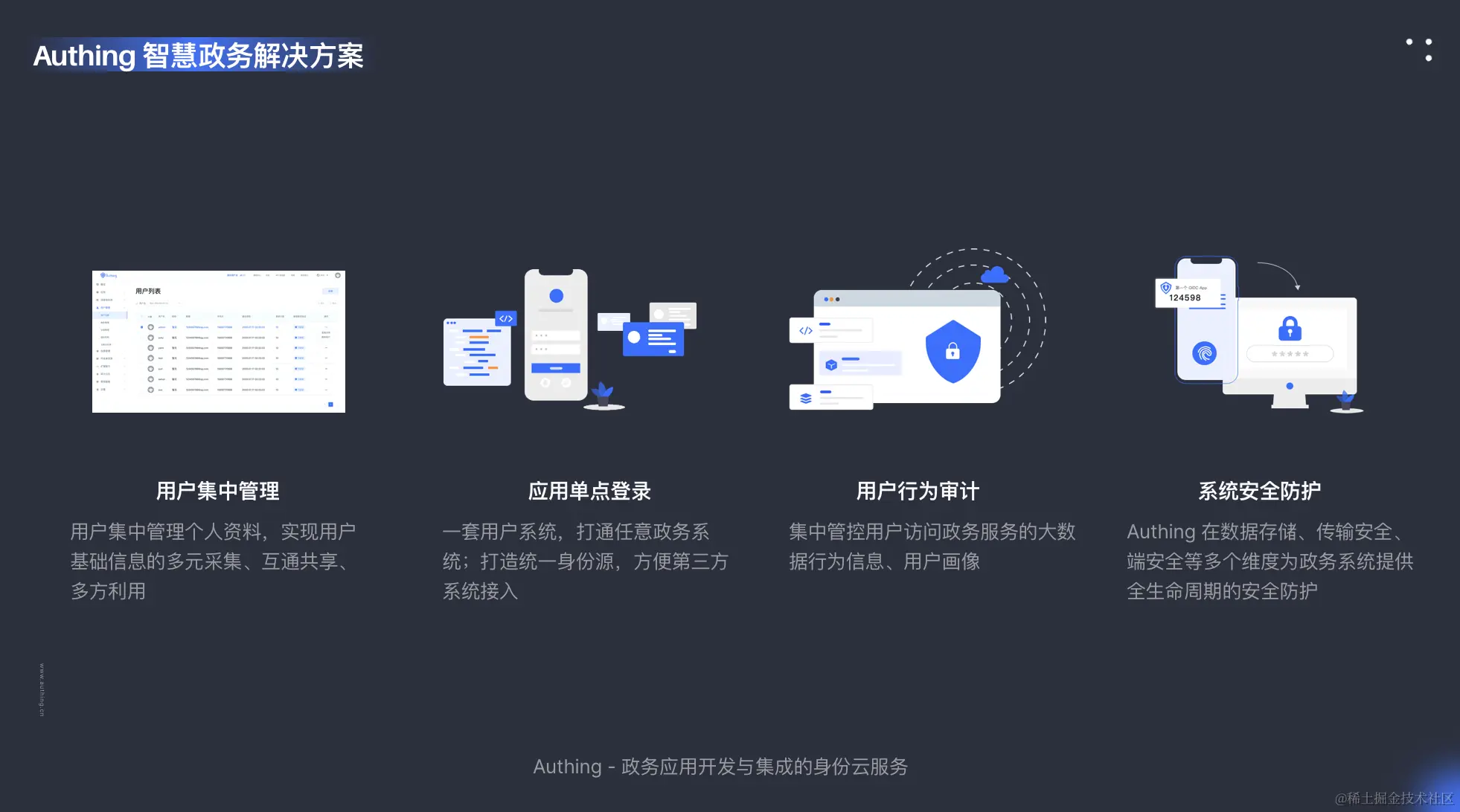 为了达成这个目标, Authing 有四项重点产品可以做为支撑,首先是在 Authing 控制台做所有公民和办事人员的身份信息的集中管理,其次是单点登录技术,让公民通过一个账号访问所有系统,第三是用户行为审计,第四是通过多重安全防护策略进行防护。