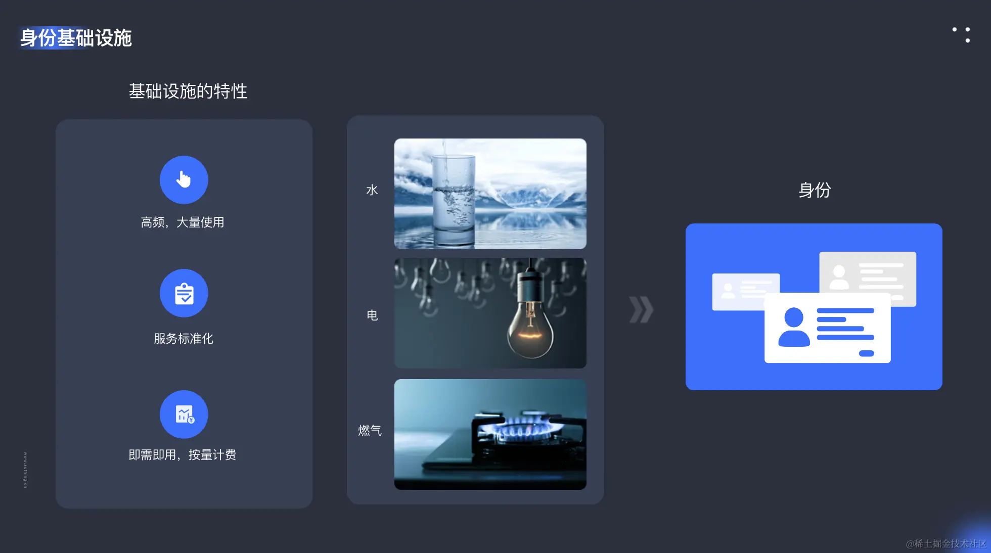 基础设施的定义是「为社会生产和居民生活提供服务的设施和系统」。以生活中常见的水电煤气举例,它应该是所有人高频率、大量需要的东西。其次,它可以做成极度标准化的产品或服务,第三他们应该是即需即用,按量计费的。如果我们把身份做对比,就会发现它满足以上所有的条件。因此,通过 IDaaS 把身份构建成为基础设施将带来巨大的价值。