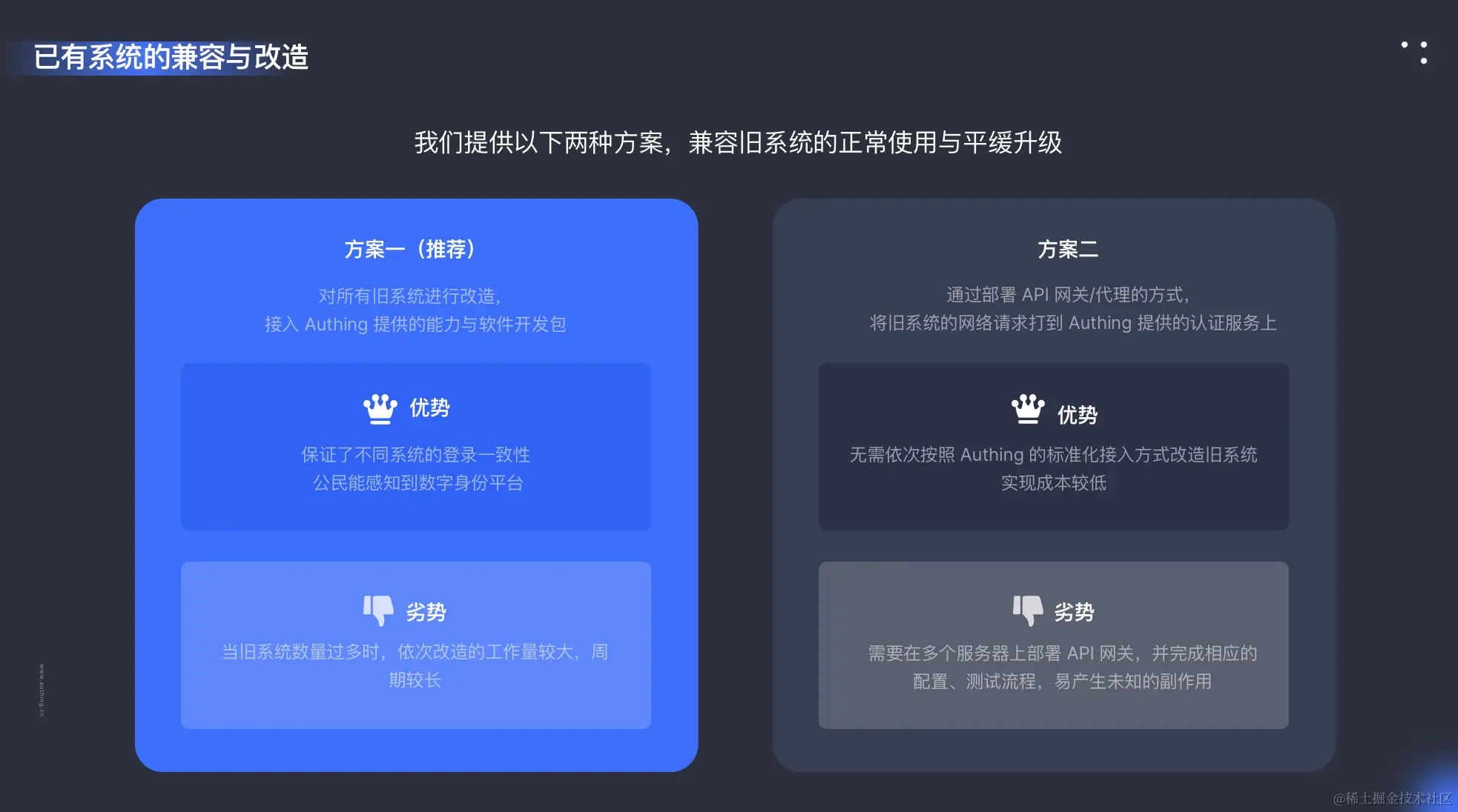 如何对政府内已有的数百个系统进行改造呢?我们设计了两个方案:一是通过对全部旧系统的前后端整体改造,接入 Authing 提供的能力和软件开发包;我们更推荐采用这一种,核心原因是整体改造后所有的公民在访问政务系统时,都能直观的感觉到政府接入了统一的数字身份解决方案。但考虑到政府内部项目过多,老项目改造的成本过高,我们也提供两种通过部署网关代理的方式,将旧系统的网络请求打到 Authing 提供的认证服务器上。这样的改造成本会小很多,但系统原有的登录界面就会被保留,这两种方案各有利弊,届时可结合实际情况灵活选择。