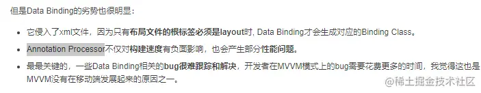 - 视图绑定的主要优点是速度和效率。它具有较短的构建时间,因为它避免了由于注释处理器影响数据绑定的构建时间而导致的与数据绑定相关的开销和性能问题。