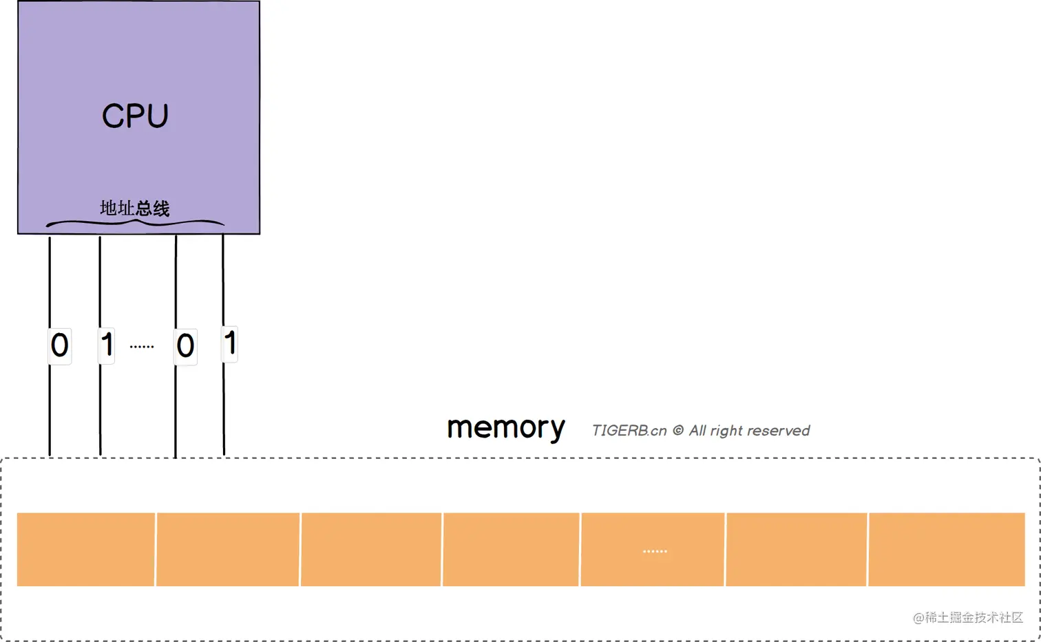内存的地址(存储单元的编号)是通过地址总线传递的,地址总线里的“每一根线”传递二进制0或1,如下图所示(实际不是这么简单,图示为了便于大家理解)。