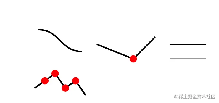 <svg width="400" height="100" viewBox="0 0 400 100" xmlns="http://www.w3.org/2000/svg"> <defs> <marker id="triangle2" markerUnits="strokeWidth" markerWidth="8" markerHeight="8" refX="0" refY="4" orient="auto"> <path d="M 0 0 L 8 4 L 0 8 z" fill='red'/> </marker> <marker id="dot" viewBox="0 0 10 10" refX="5" refY="5" markerWidth="5" markerHeight="5"> <circle cx="5" cy="5" r="5" fill="red" /> </marker> </defs> <path d="M 20,10 C 50,10 50,40 80,40" stroke="black" stroke-width="2" fill="none" marker-mid="url(#dot)"/> <path d="M 100,30 L 150,50 L 180,20" stroke="black" stroke-width="2" fill="none" marker-mid="url(#dot)" /> <line x1="200" y1="30" x2="250" y2="30" stroke="black" stroke-width="2" fill="none" marker-mid="url(#dot)" /> <line x1="200" y1="50" x2="250" y2="50" stroke="black" stroke-width="1" fill="none" marker-mid="url(#dot)" /> <polyline points="15,90 29,80 43,70 57,90 71,80 85,100" stroke-width="2" fill="none" stroke="black" marker-mid="url(#dot)"/> </svg>