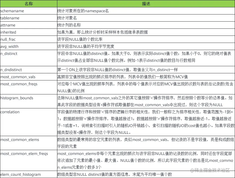 单列统计信息是指表的单列的数据特征信息,存储在系统表pg_statistic中。因为pg_statistic会存储一些关键采样值来描述数据特征,因此pg_statistic数据是敏感的,只有超级用户才可以访问pg_statistic。通常我们推荐用户使用查询系统视图pg_stats来查询当前用户有查询权限的表的统计信息,同时pg_stats信息的可读性更强,pg_stats字段信息如下