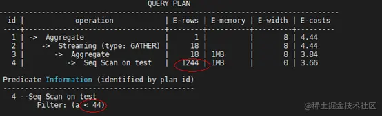 那么表中满足a<56的tuples的个数为1243.6015680 ≈1244,通过explain打印执行计划如下