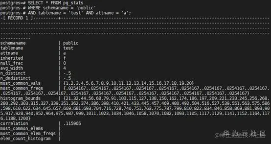 通过统计新可以看出public.test的a列的NULL值比例为0,存在120个distinct值, 120是MCV值,每个出现的概率是0.0254167;211200出现在在直方图统计信息中;