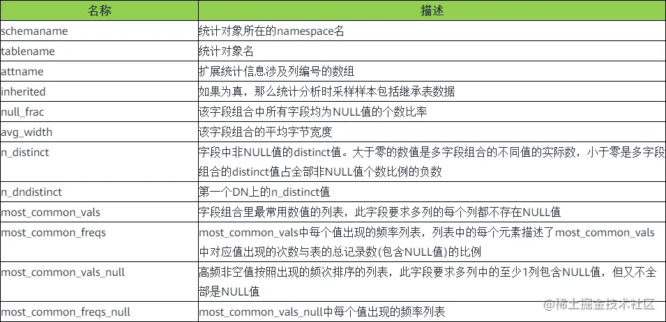 扩展统计信息存储在系统表pg_statistic_ext里面,当前只支持多列统计信息这一种扩展统计信息类型。pg_statistic_ext会存储一些关键采样值来描述数据特征,因此pg_statistic_ext数据是敏感的,只有超级用户才可以访问pg_statistic_ext,通常我们推荐用户使用查询系统视图pg_ext_stats来查询当前用户有查询权限的扩展统计信息。