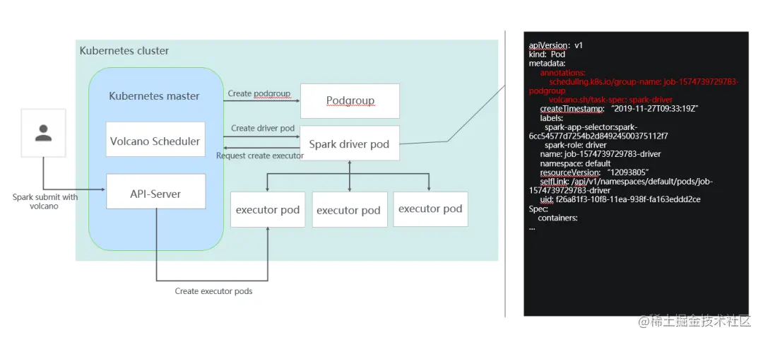 在这里面Volcano做的事情其实也很简单,你看整个提交的过程,首先是通过spark submit提交作业,提交作业时会创建一个podgroup,podgroup包含了用户配置的一些调度相关的信息。它的yaml文件大家可以看到,页面右边这个部分,增加了driver和executor两个角色。