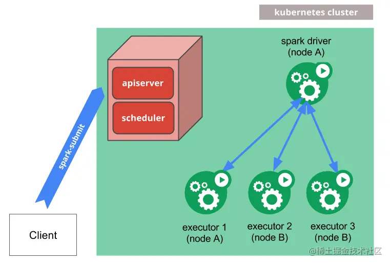 Spark对于Kubernetes的支持,最早的一种工作方式是通过 Spark官方的spark submit方式去支持,Clinet通过Spark submit提交作业,然后spark driver会调用apiserver的一些api去申请创建 executor,executor都起来之后,就可以执行真正的计算任务,之后会做日志备份。