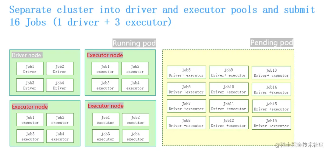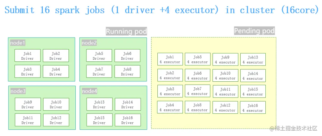 同时提交16个spark job的时候,driver pod的创建和executor pod的创建之间有一个时间差。因为有这个时间差,当16个spark的job跑起来之后把整个机群全部占满了,就会导致同时提交并发量特别大作业的时候,整个集群卡死。
