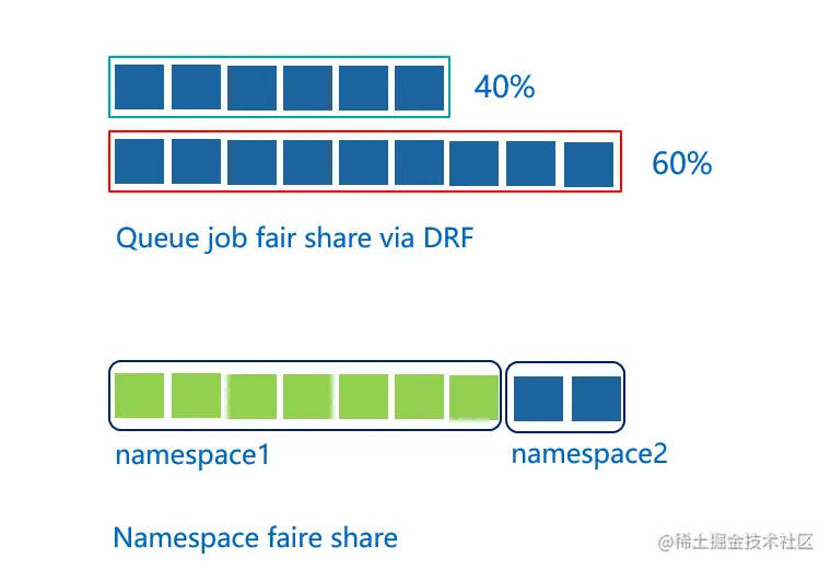 在通过队列做资源共享时,我们提供了多种机制。图最上面的这种,这里面我们创建两个队列,通过这两个队列去共享整个集群的资源,一个队列给他分40%的咨询资源,另一个给他分60%的资源,这样的话就可以把这两个不同的队列映射到不同的部门或者是不同的项目各自使用一个队列。这在一队列里,资源不用的时候,可以给另外一个队列里面的作业去使用。下面讲的是两个不同的namespace之间的资源平衡。Kubernetes里当两个不同的应用系统的用户都去提交作业时,提交作业越多的用户,他获得的集群的资源会越多,所以在这里面基于namespace,我们进行公平的调度,保证namespace之间可以按照权重分享集群的资源。