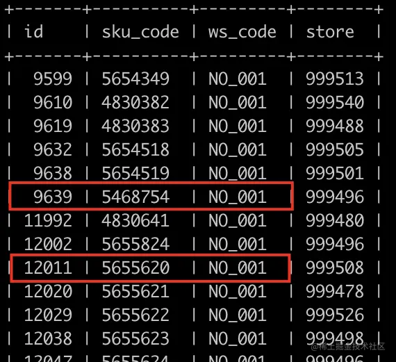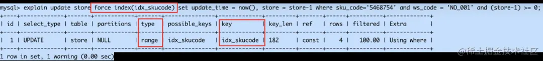 这个sql的业务含义就是对某个商品(skuCode)从某个仓库(wsCode)中扣减store个库存量,同时上面的where条件同时出现了sku_code和ws_code字段,压测数据中 sku_code的选择度要比ws_code高,理论上这条sql应该会走idx_skucode索引,那么真实情况是怎样的呢?