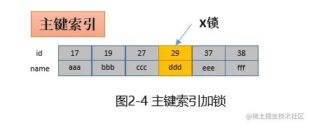 update t set name='xxx' where id=29;只需要将主键上id=29的记录加上X锁即可(X锁称为互斥锁,加锁后本事务可以读和写,其他事务读和写会被阻塞)。如下: