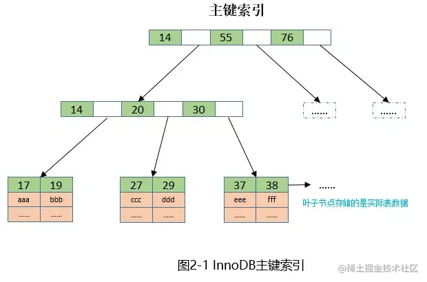 对InnoDB而言,主键索引和数据是存放在一起的,构成一颗B+树(称为索引组织表),主键位于非叶子节点,数据存放于叶子节点。示意图如下: